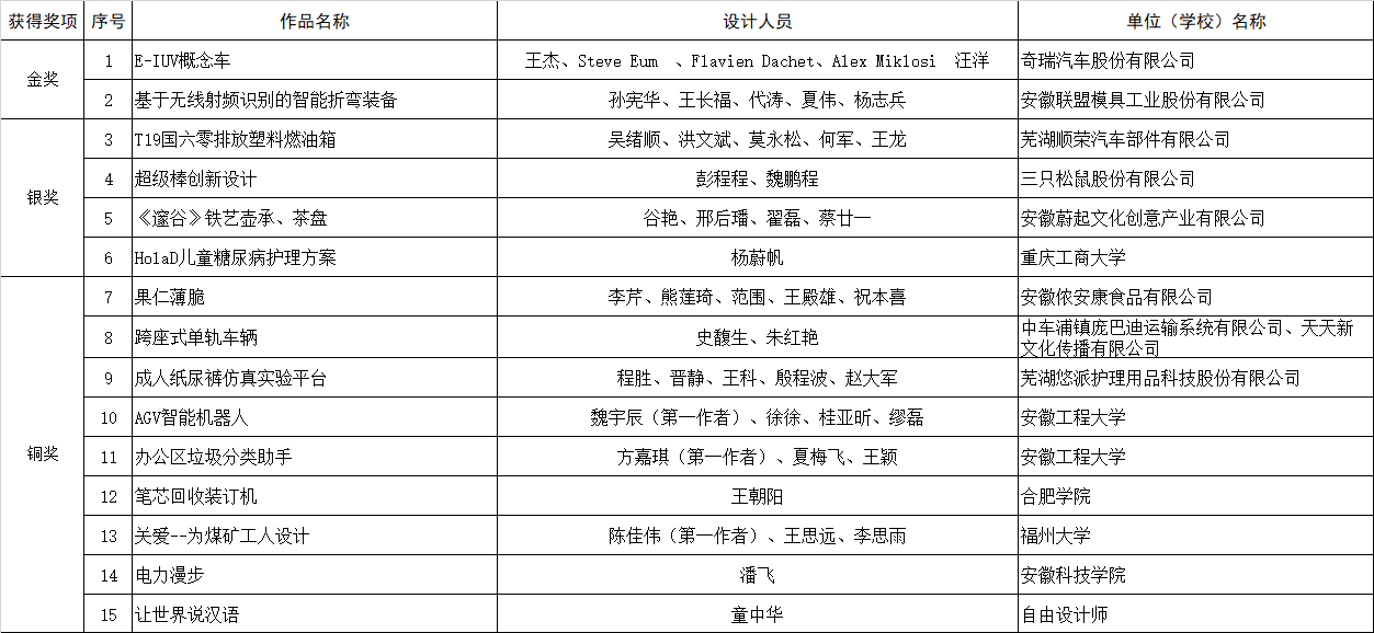 最終,來自奇瑞汽車的E-IUV概念車(概念設(shè)計)與安徽聯(lián)盟模具工業(yè)有限公司的基于無線射頻識別的智能折彎裝備( 實物產(chǎn)品)榮獲本次大賽金獎,從設(shè)計理念、產(chǎn)品外形、先進技術(shù)在產(chǎn)品中的應(yīng)用以及解決行業(yè)痛點等關(guān)鍵問題上,以上作品在行業(yè)中均處于領(lǐng)先水平。同時,來自順榮股份、三只松鼠、美的冰箱、中車龐巴迪(蕪湖)、安徽工程大學(xué)、安徽工業(yè)大學(xué)等企業(yè)、高校投稿作品也在本次大賽中取得了優(yōu)異的成績。
